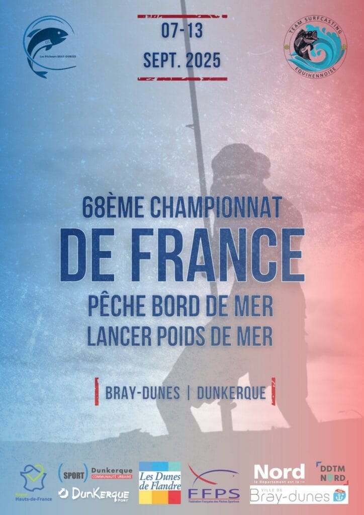 La Team Surfcasting Equihennoise et Les Pêcheurs Bray-Dunois ont l’honneur d’organiser le 68ème Championnat de France de Pêche en Bord de mer et de Lancer de Poids de mer du 07 au 13 septembre 2025 à Dunkerque et Bray-Dunes.