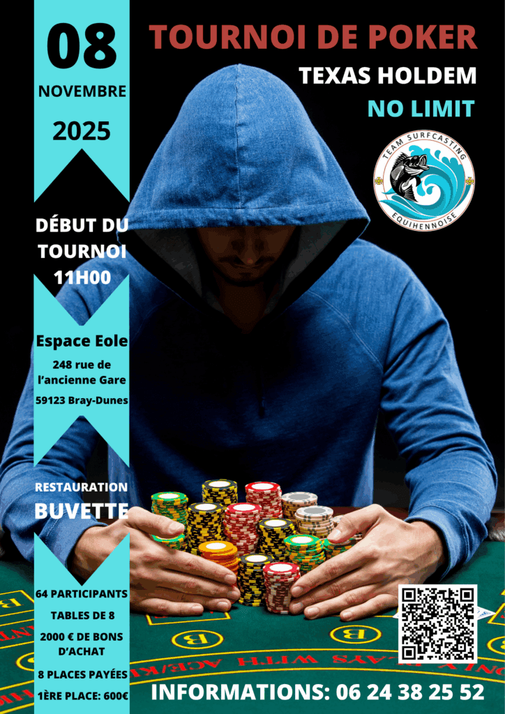 La Team Surfcasting Equihennoise a le plaisir d’organiser un grand tournoi de Poker Texas Hold Em No Limit le samedi 08 novembre 2025 à Bray-Dunes.